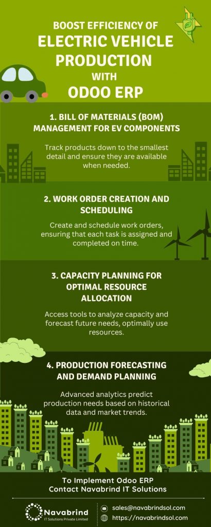 In conclusion, the electric vehicle (EV) industry faces unique production challenges that necessitate innovative solutions. Odoo ERP stands out as a critical tool, streamlining processes from battery assembly to vehicle integration with features like detailed BOMs, work order scheduling, and real-time data analytics. This comprehensive system helps reduce production time, improve quality, and lower costs while managing complex inventories and ensuring rigorous quality control. As EV manufacturing evolves with trends in automation, data-driven practices, and IoT integration, Navabrind IT Solutions’ expertise in Odoo ERP implementation provides EV companies with the support needed to enhance efficiency, productivity, and sustainable practices, ultimately advancing the future of eco-friendly transportation.