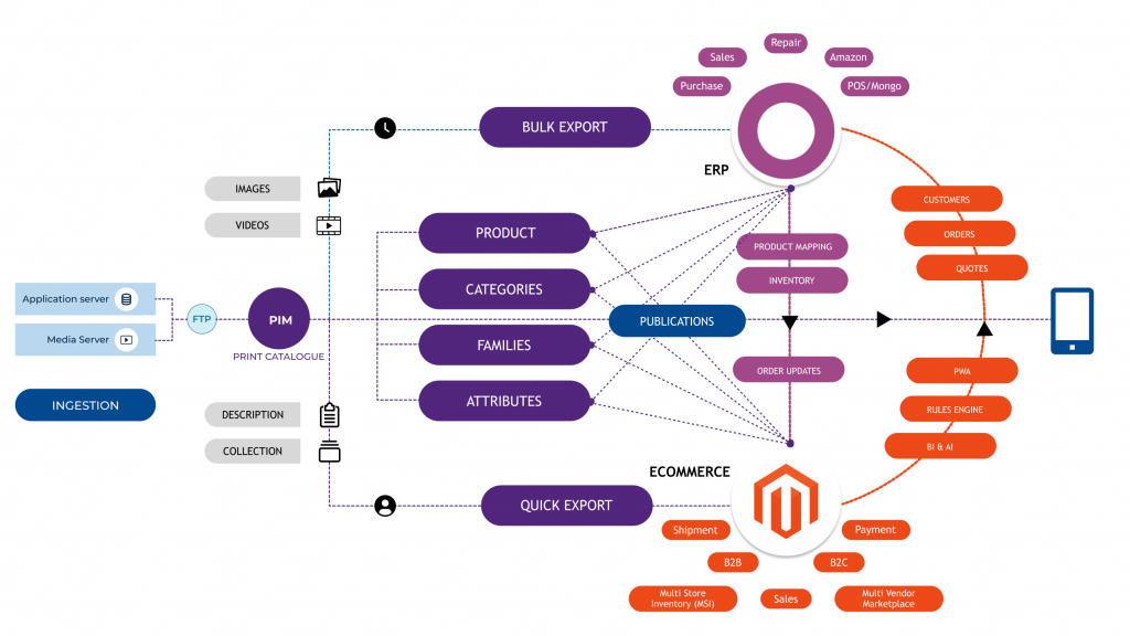 Delivering a powerful infrastructure for your B2B with unique integrations covering the front end with Magento, BigCommerce, WooCommerce, and Shopify; Akeneo, Pimcore PIM systems for enriched product data, and Backend optimized with Odoo modules.