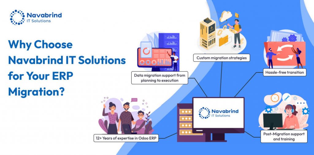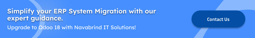 A migration partner with in-depth knowledge of both platforms can efficiently map existing workflows, extract and cleanse data, and integrate necessary customizations while ensuring data integrity. Navabrind IT Solutions, a trusted name in Odoo ERP migration, specializes in helping businesses migrate from legacy ERP systems to Odoo. With expertise in Odoo 18 upgrade, our team ensures that your business benefits from the latest Odoo features, including AI-powered automation, improved UI, and advanced analytics. Whether it’s handling ERP data migration to Odoo, managing system integrations, or training employees for a smooth adaptation, Navabrind IT Solutions provides end-to-end migration support, ensuring a future-ready ERP ecosystem tailored to your business needs.
