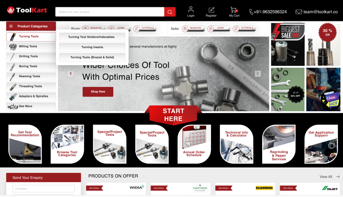 Toolkart, a specialist in high-performance machine tools, indexable tools, carbide cutting tools, and more, sought out Navabrind IT Solutions to revamp their website for enhanced customer experience. Their legacy site lacked the functionality for clients to customize orders and purchase online. Toolkart aimed to strengthen their online presence by launching an advanced marketplace, providing customers with seamless order customization and expanding their digital footprint.